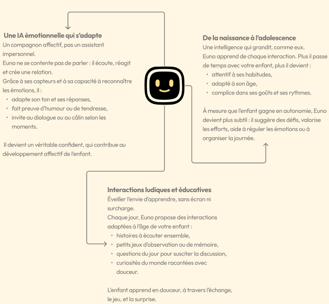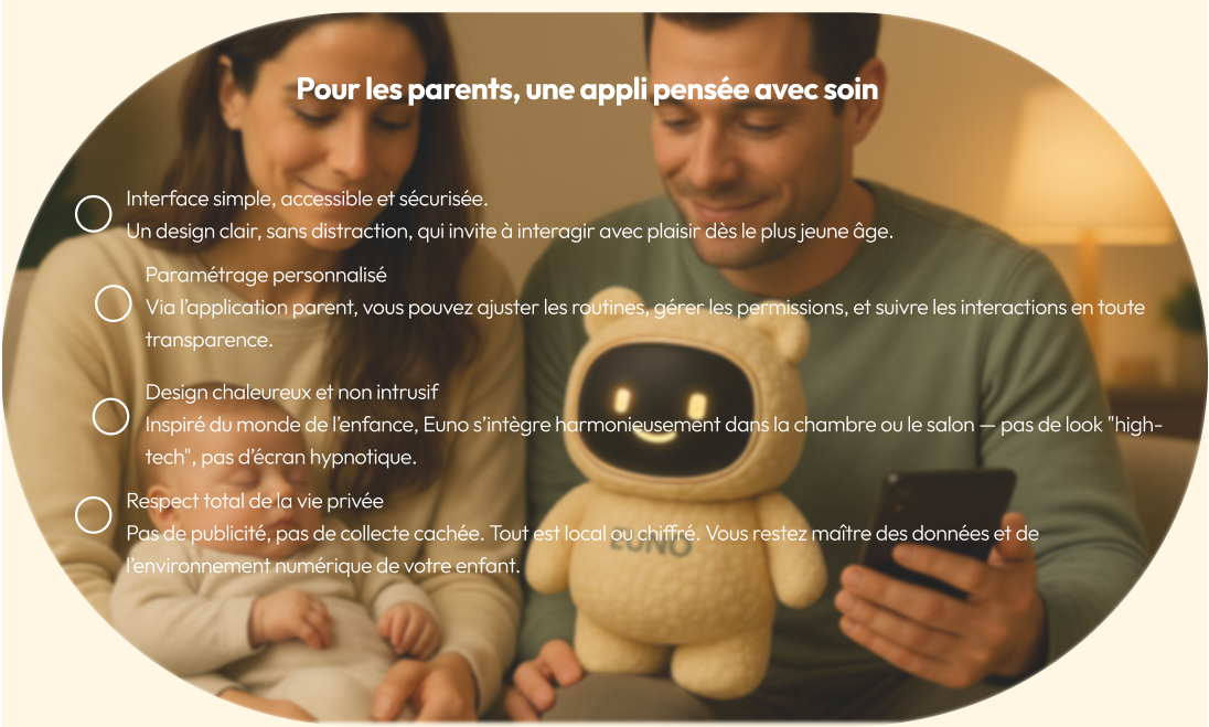 Nous ne construisons pas des gadgets, mais des liens. Nos technologies sont conçues pour prendre soin de l’humain, pas pour le remplacer. Avec Euno, nous imaginons un futur plus doux, plus attentif, plus relationnel.