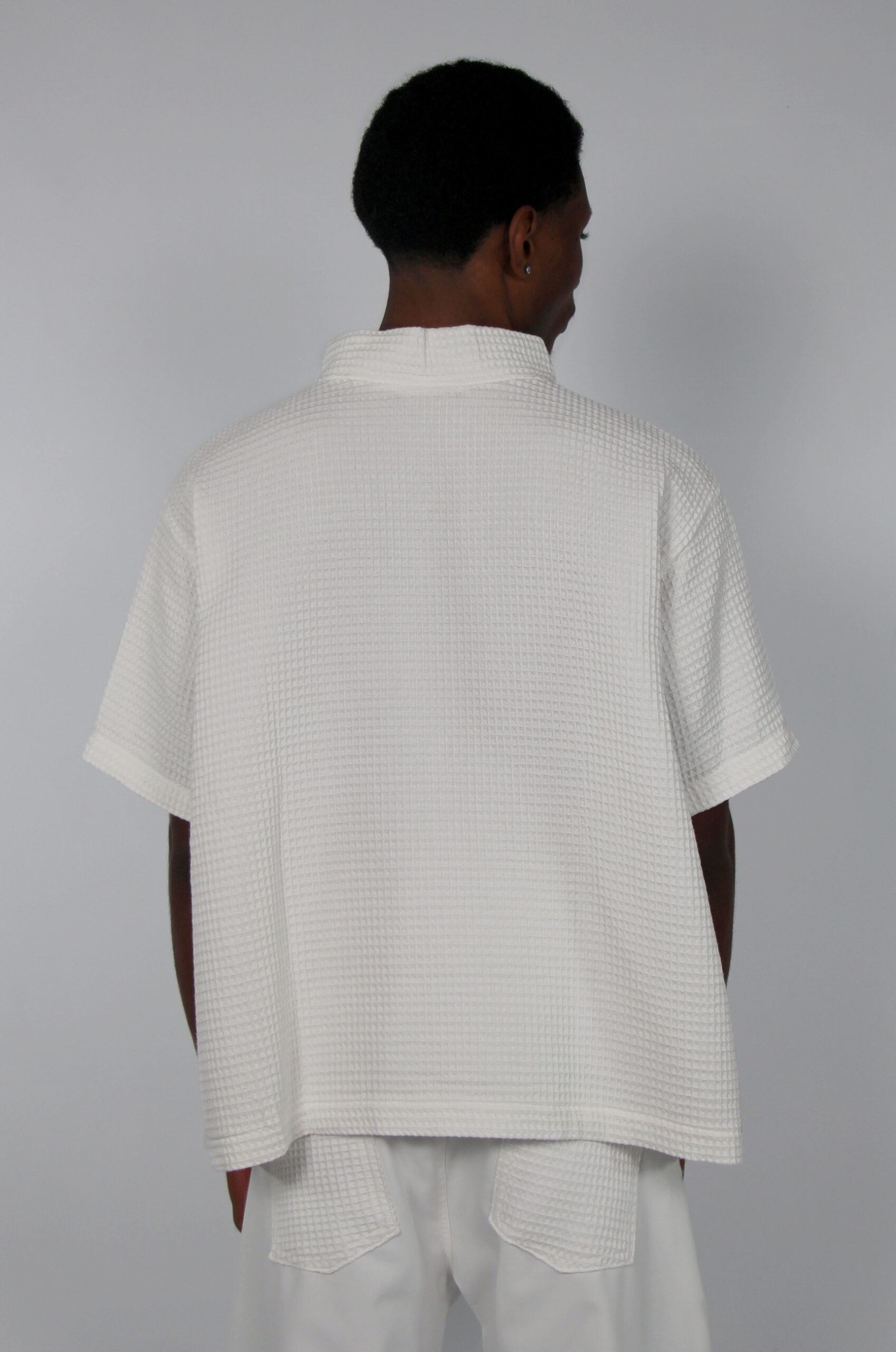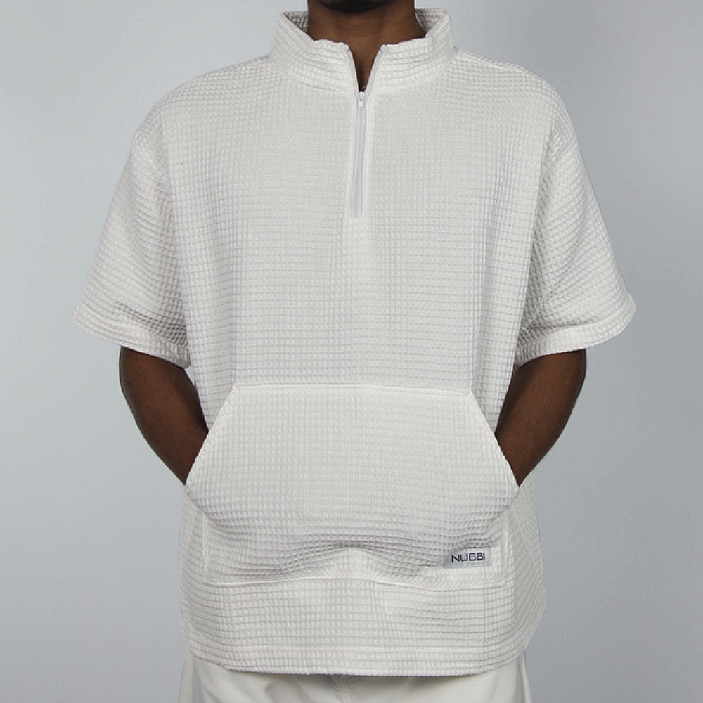 Pièce unique : coupe-vent oversize blanc en nid d’abeilles, manches courtes, poche kangourou et col montant zippé.