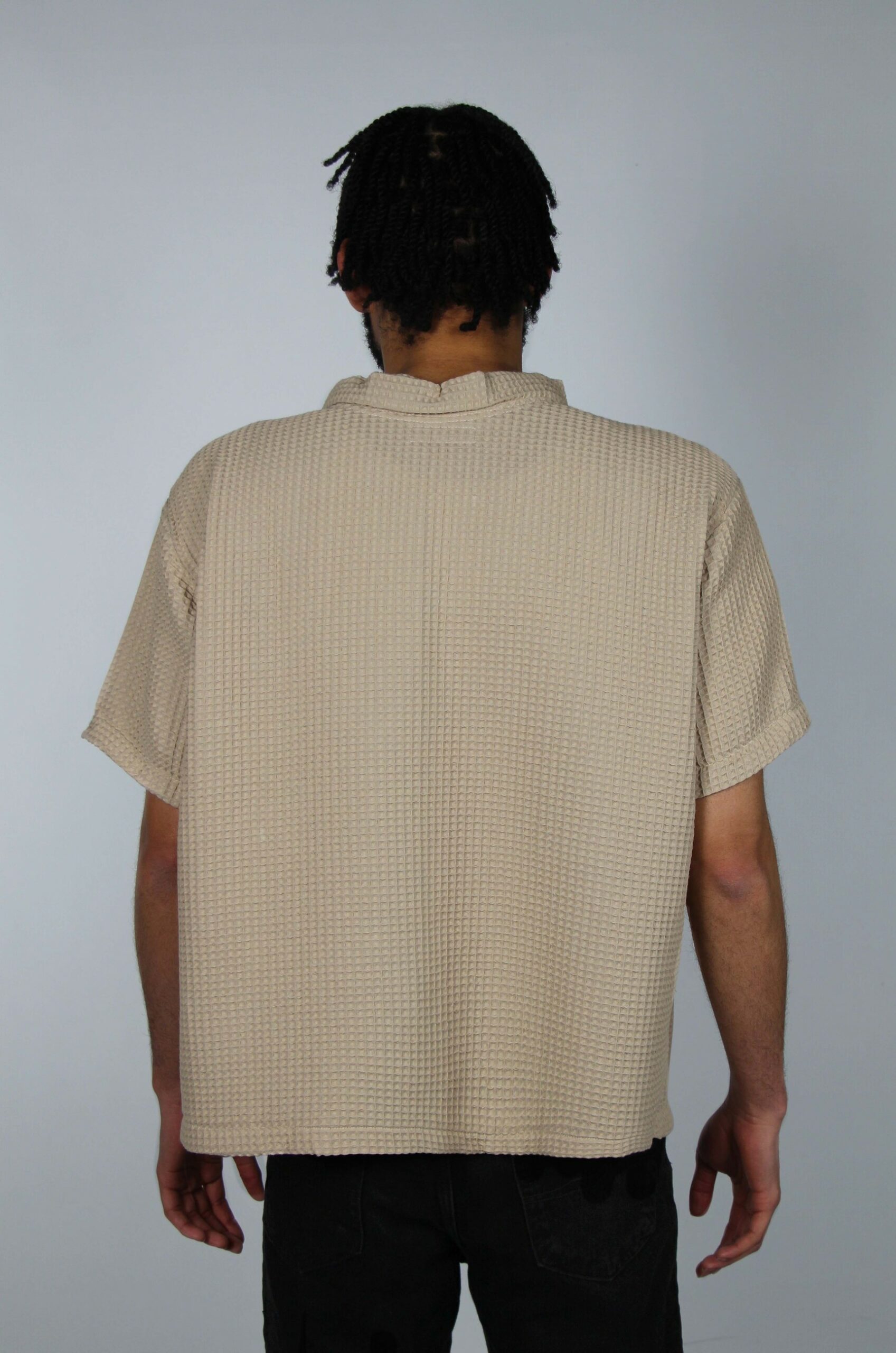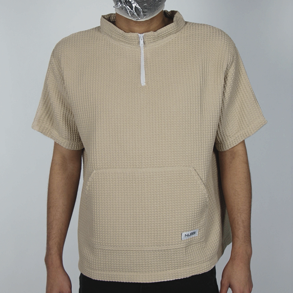 Pièce unique : coupe-vent oversize beige en nid d’abeilles, manches courtes, poche kangourou et col montant zippé.